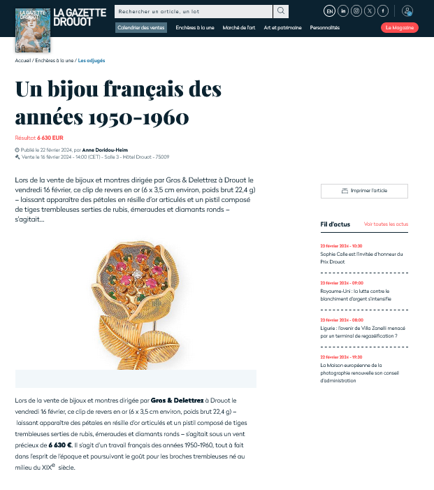 Le clip de revers articulé, adjugé 5 100 € le 16 février dernier, est dans la Gazette Drouot.